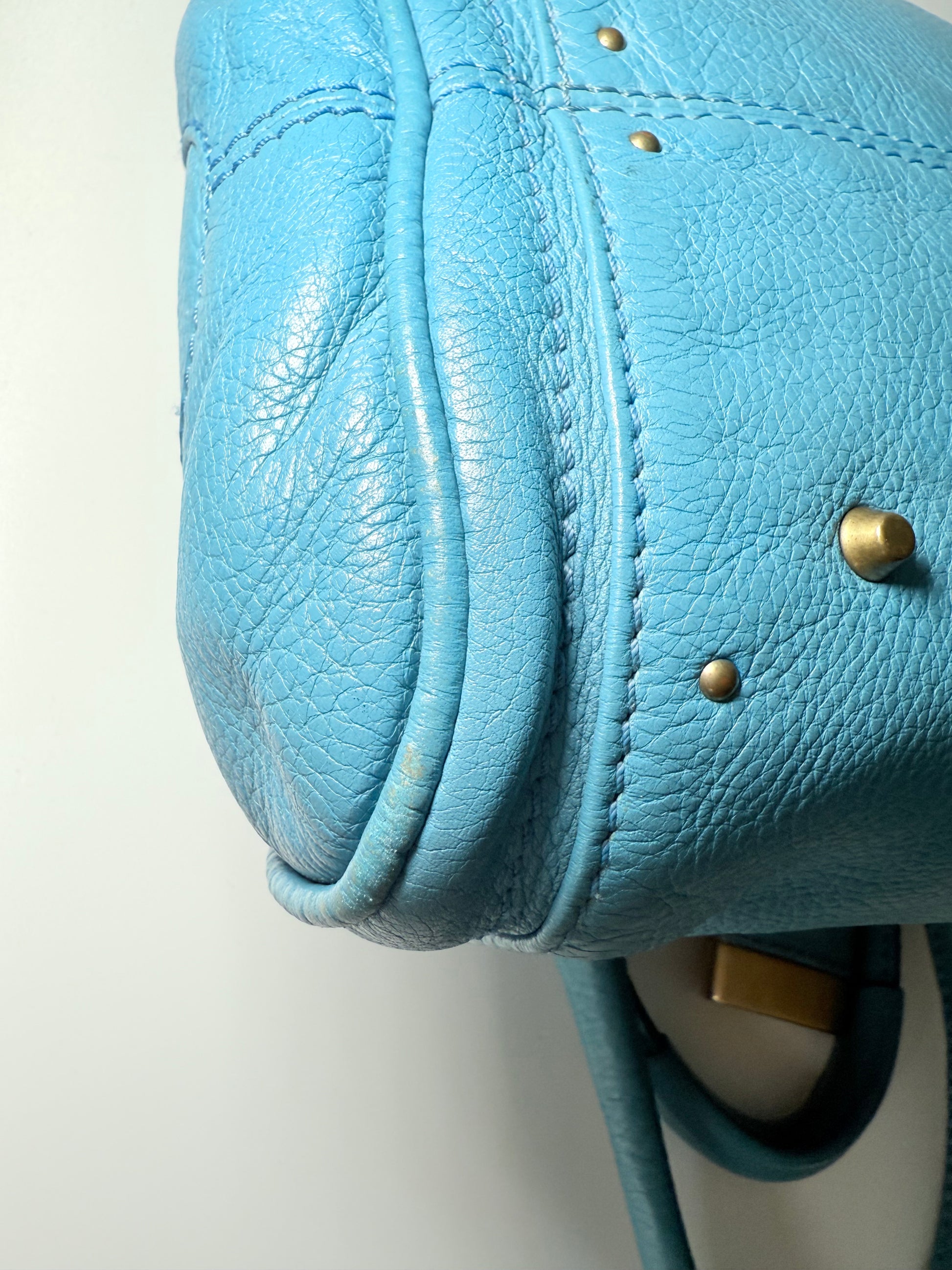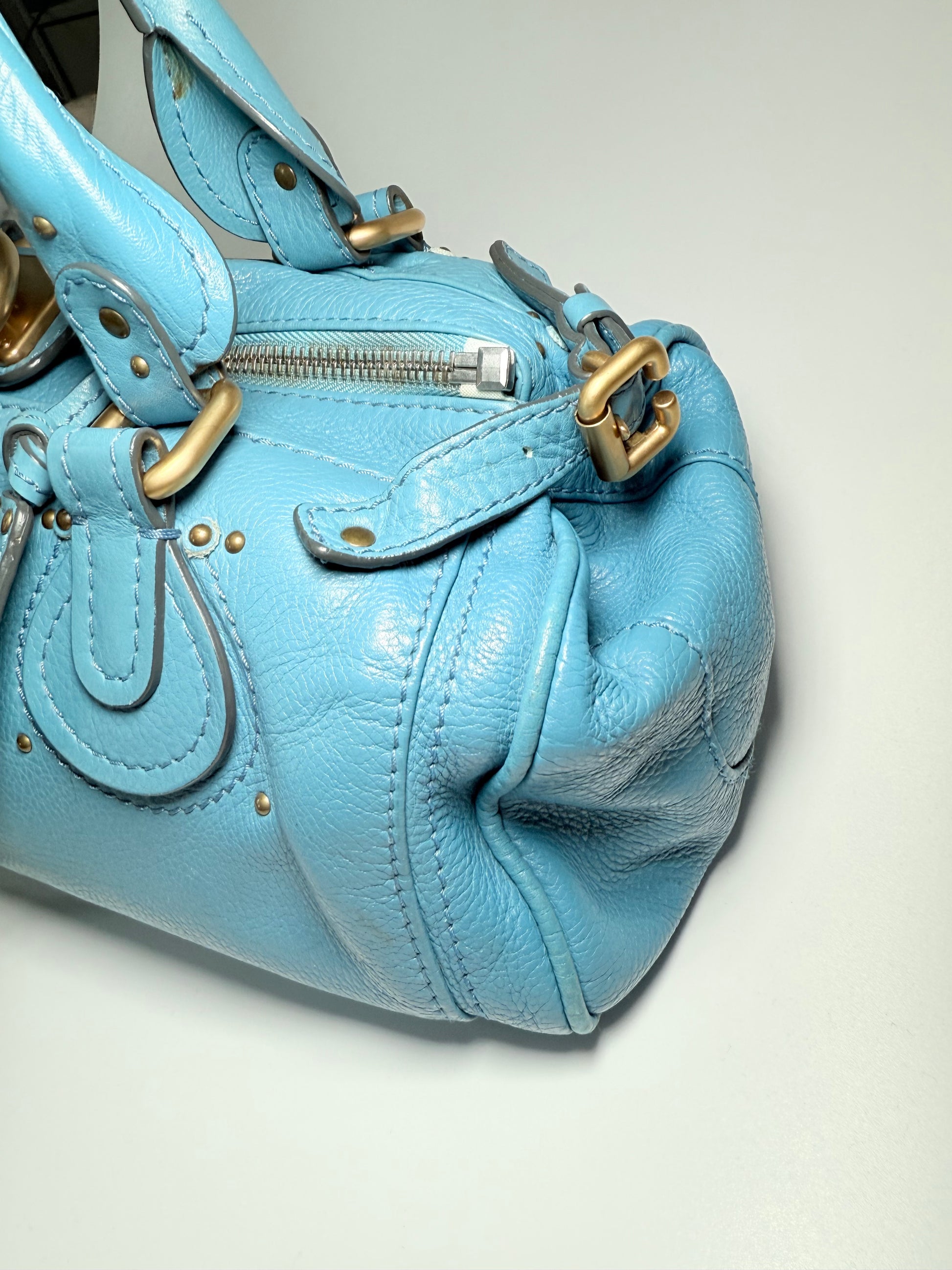Original Chloé 'Paddington' Handtasche aus blauem, genarbtem Kalbsleder mit goldfarbener Hardware. Gerundeter Korpus mit Reißverschluss, zwei Henkeln und dem charakteristischen großen Vorhängeschloss. Großes Innenfach mit zwei Seitenfächern, beige Baumwollfutter und Außentasche mit Nieten-Details. Mit Herstellerprägung und Seriennummer. Maße: H 18 cm, 36 cm x 18 cm.