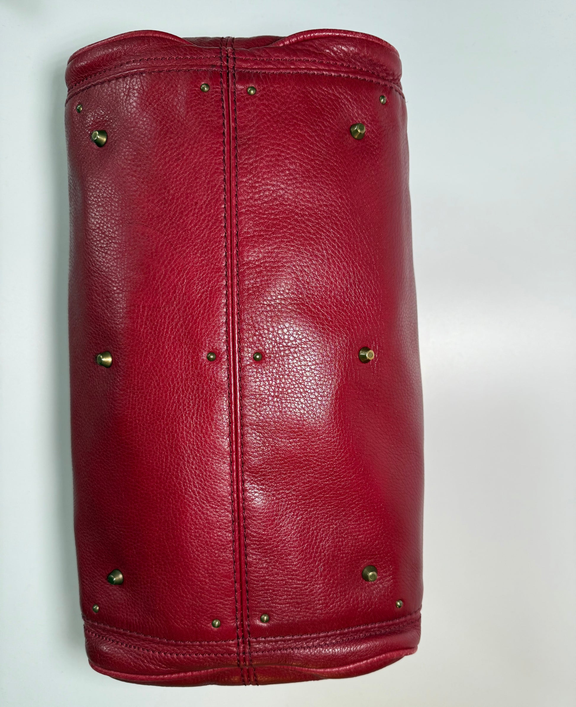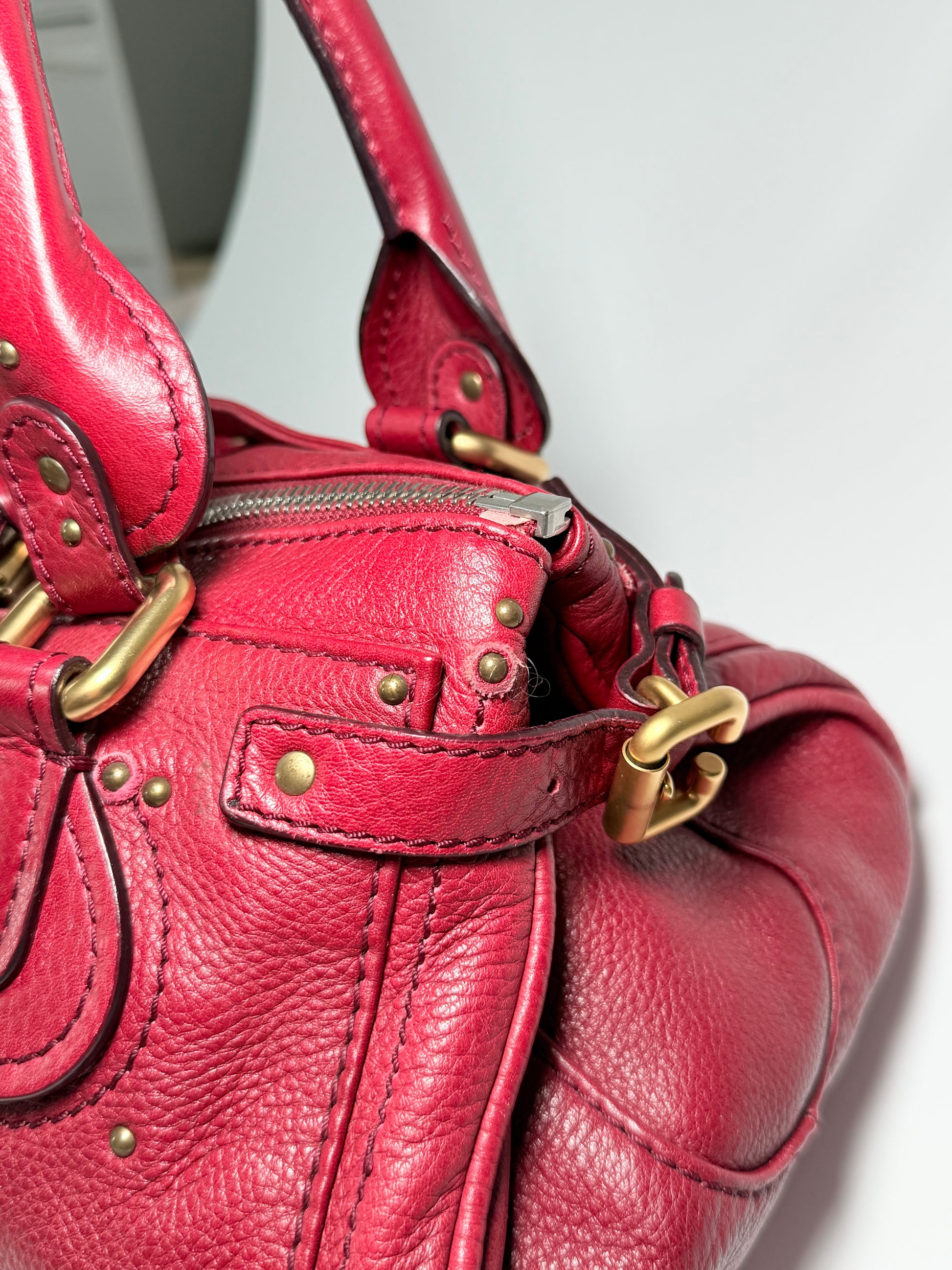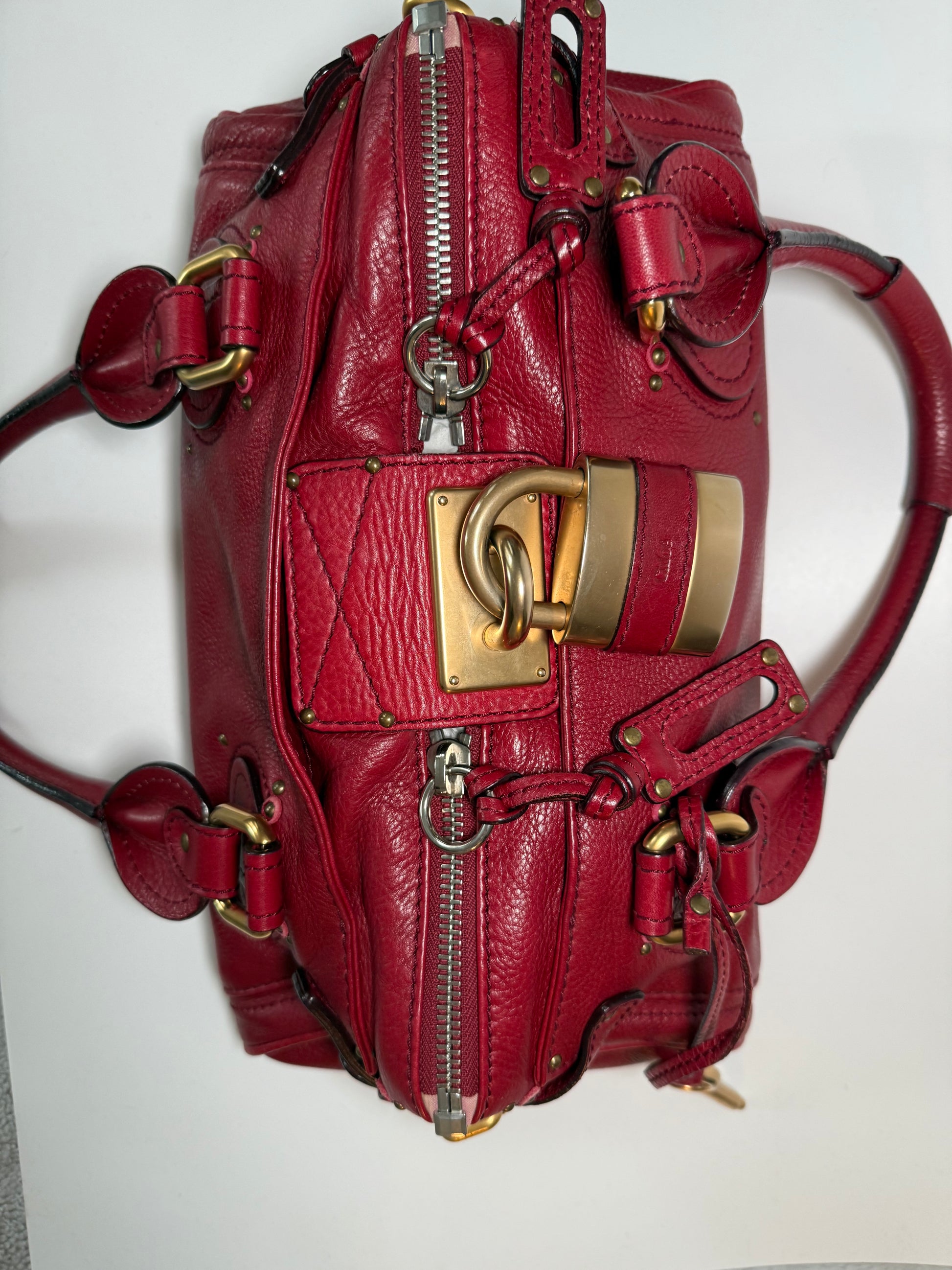 Original Chloé 'Paddington' Handtasche aus rotem, genarbtem Kalbsleder mit goldfarbener Hardware. Gerundeter Korpus mit Reißverschluss, zwei Henkeln und dem charakteristischen großen Vorhängeschloss. Großes Innenfach mit zwei Seitenfächern, schwarzes Baumwollfutter und Außentasche mit Nieten-Details. Mit Herstellerprägung und Seriennummer. Maße: H 18 cm, 36 cm x 18 cm. Zustand: sehr gut, mit leichter Abnutzung an den Ecken.