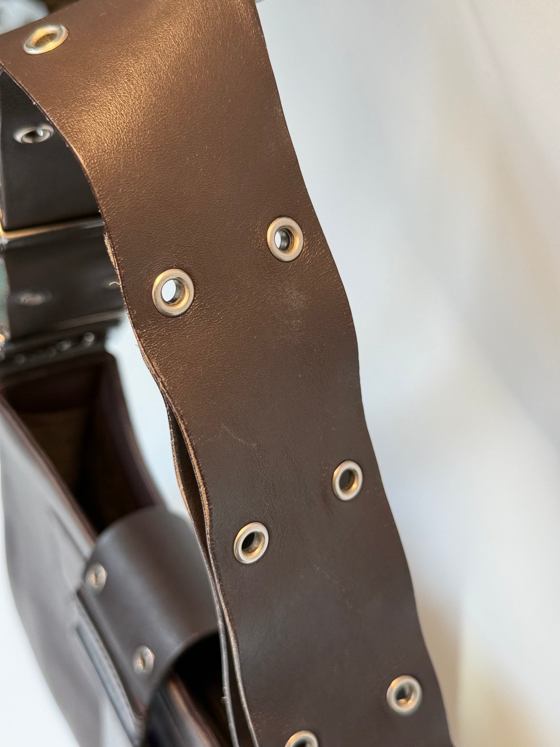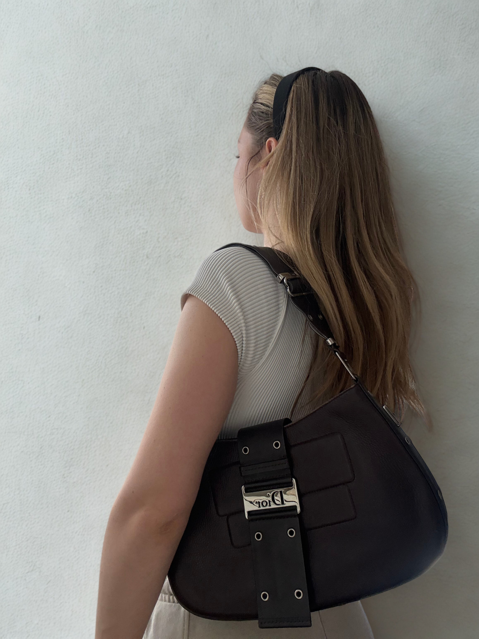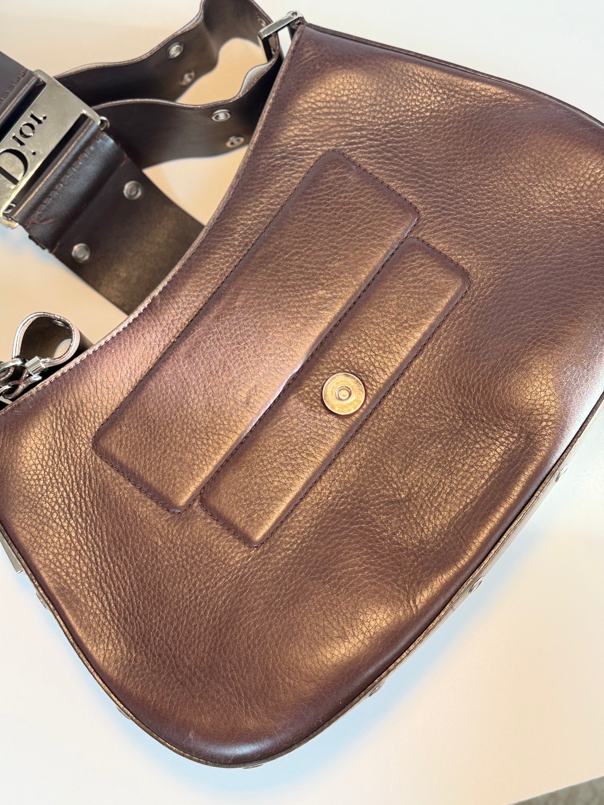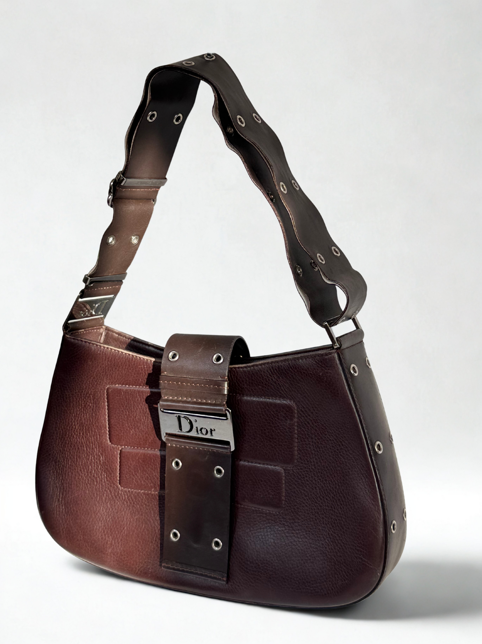 Vintage Dior shoulder bag, model Columbus, made of dark brown leather with silver-tone metal hardware and eyelet detailing. Features an adjustable leather strap with punched holes for shoulder or hand carry. Interior lined with Dior oblique jacquard fabric.