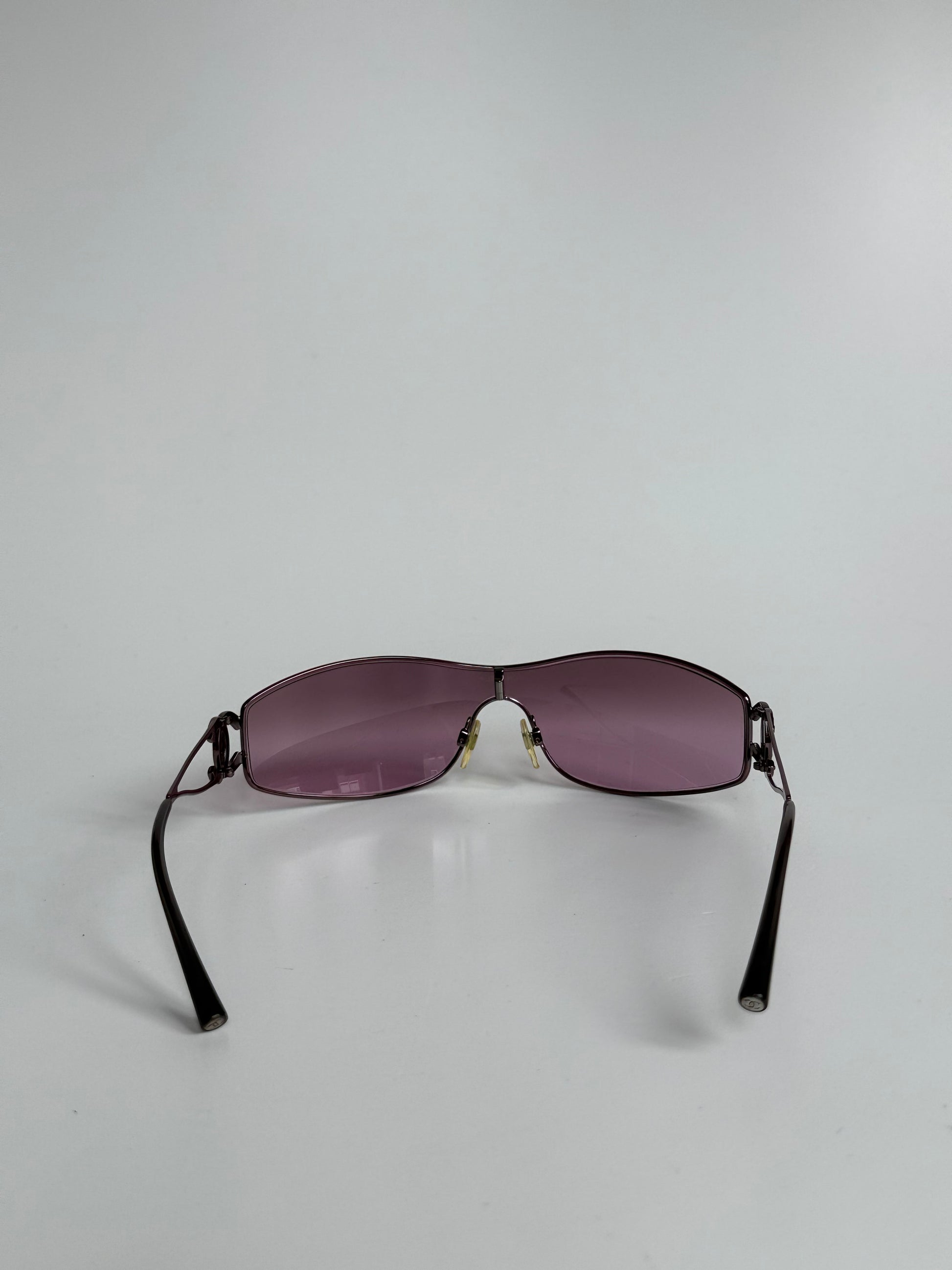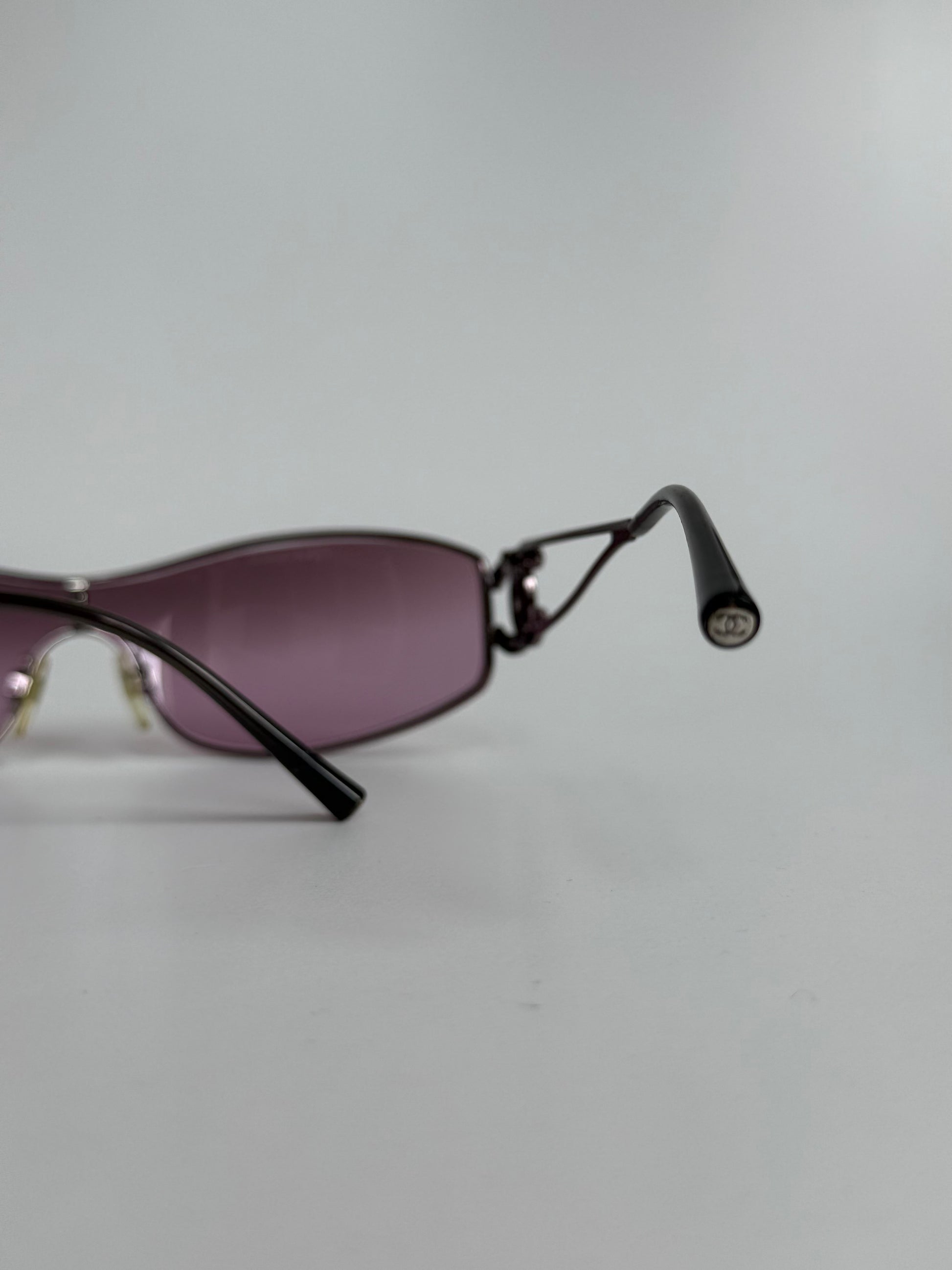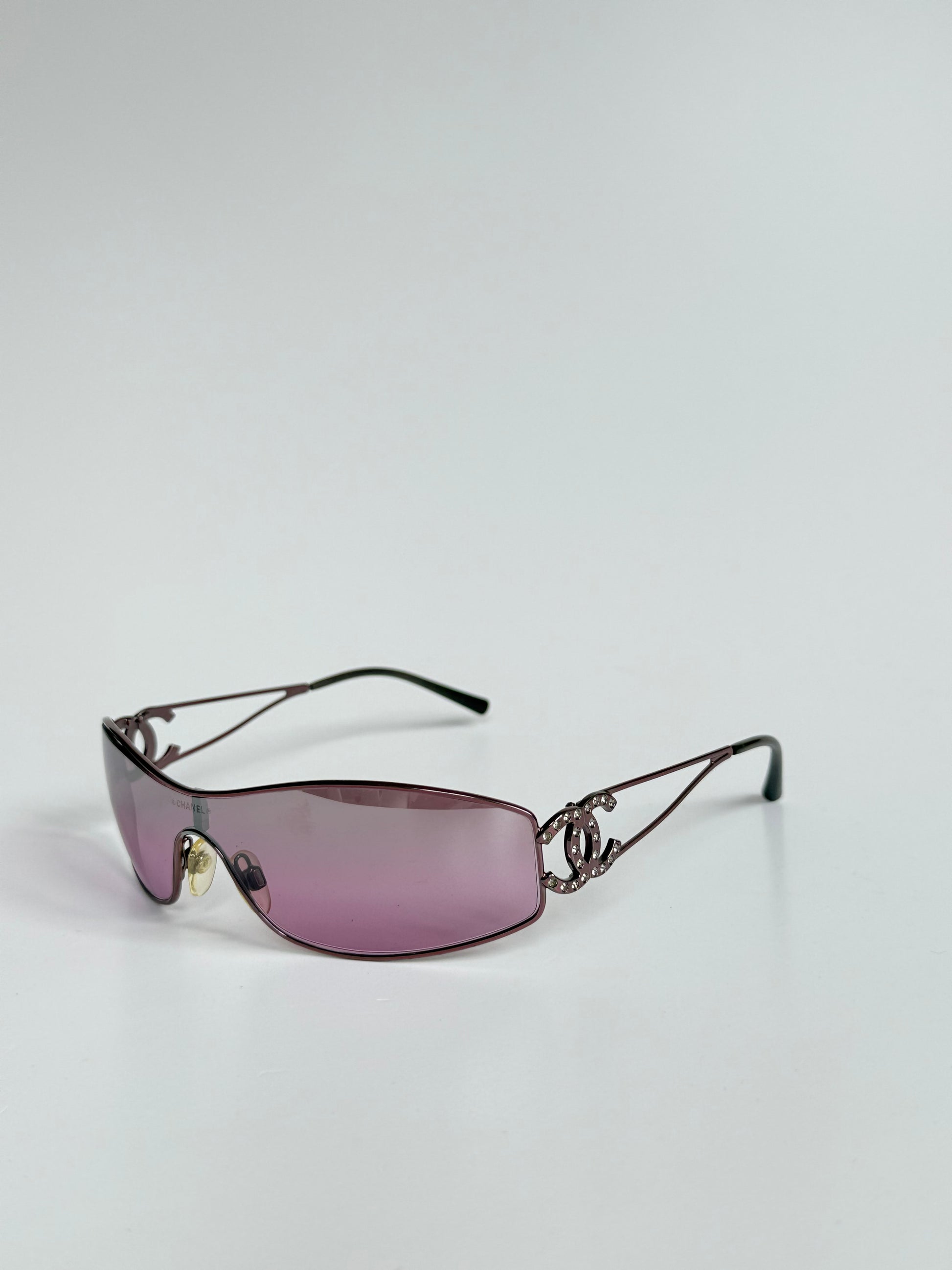 Vintage Chanel model 4073, featuring a rimless shield silhouette with rhinestone interlocking CC logos at each temple. The wraparound lens has a pink-purple gradient tint, paired with sleek metal arms and minimalist construction.