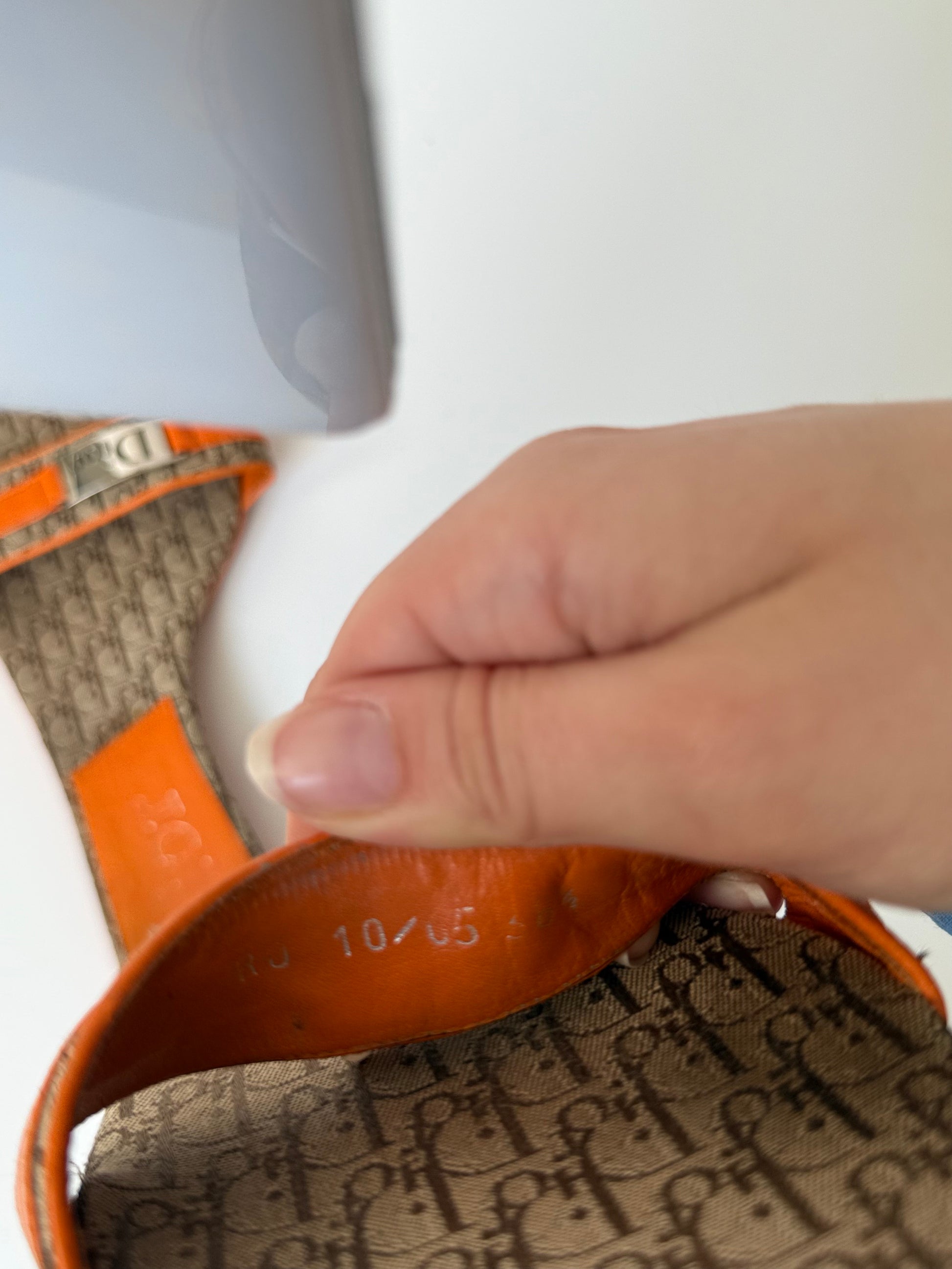 Original Vintage-Sandalen von Dior mit klassischem Oblique Monogramm. Ausgestattet mit orangenen Lederdetails und silberfarbener Dior-Hardware. Größe 38,5. Zustand: Bitte Fotos beachten.