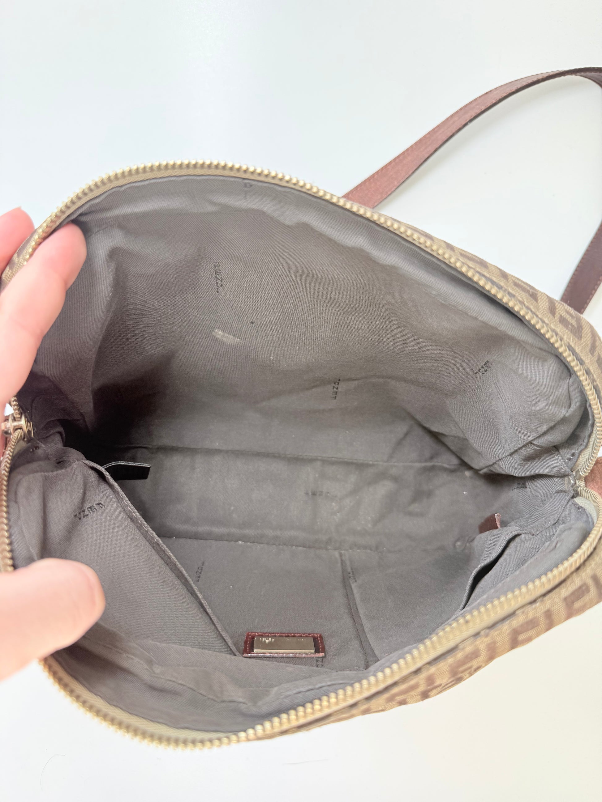 Original Vintage-Fendi-Umhängetasche mit dem klassischen Zucchino-Muster in Beige. Die Tasche verfügt über mehrere Fächer. Zustand dem Alter entsprechend: Der Lederträger zeigt Gebrauchsspuren, zudem gibt es kleinere Unreinheiten im Stoff. Geeignet für Sammler*innen oder den täglichen Gebrauch.