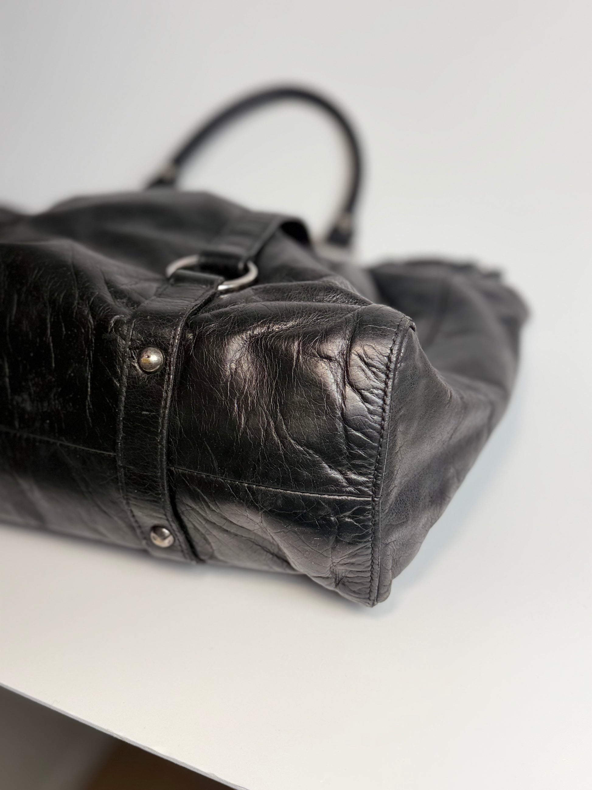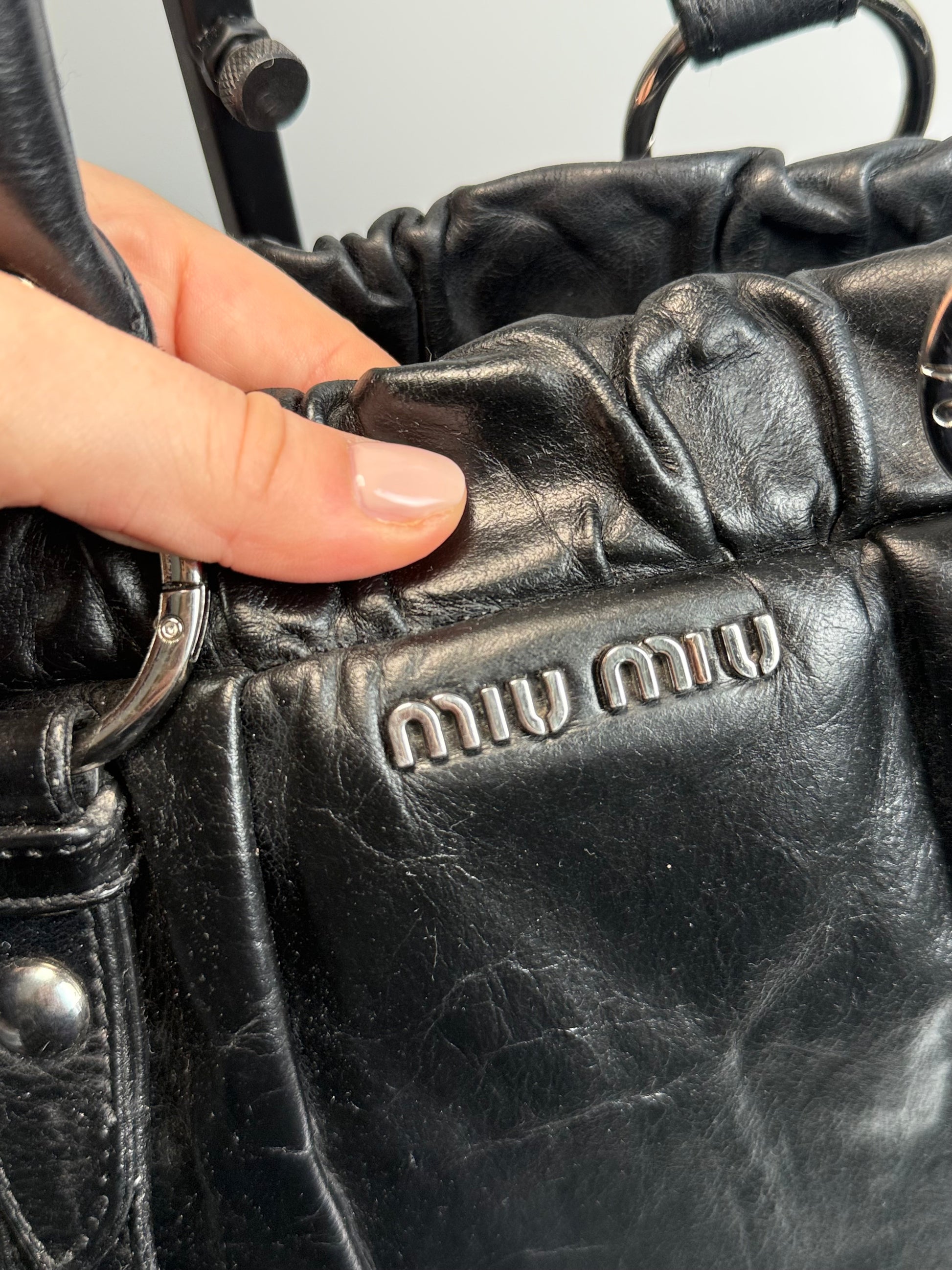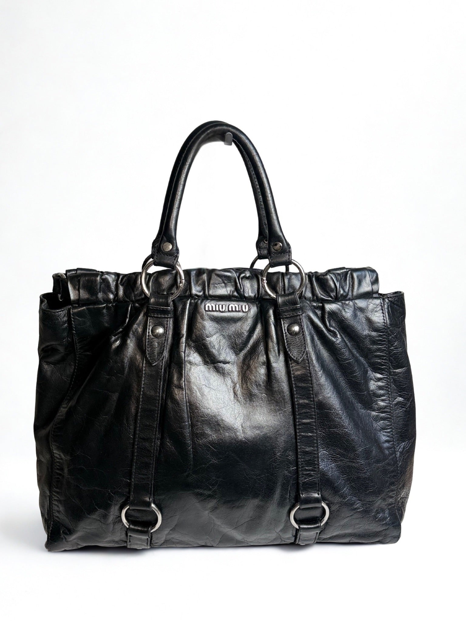 Vintage Miu Miu Vitello leather shopper in black with silver-tone hardware. Crafted from supple Vitello leather, this spacious tote features two top handles, ruched leather detailing, and a soft black satin lining. The bag measures approximately 32 cm in height, 45 cm in width, and 13 cm in depth. A recent professional leather color refresh has restored the black tone, resulting in a very good overall condition with minimal signs of wear. An elegant and practical piece from Miu Miu’s archive.